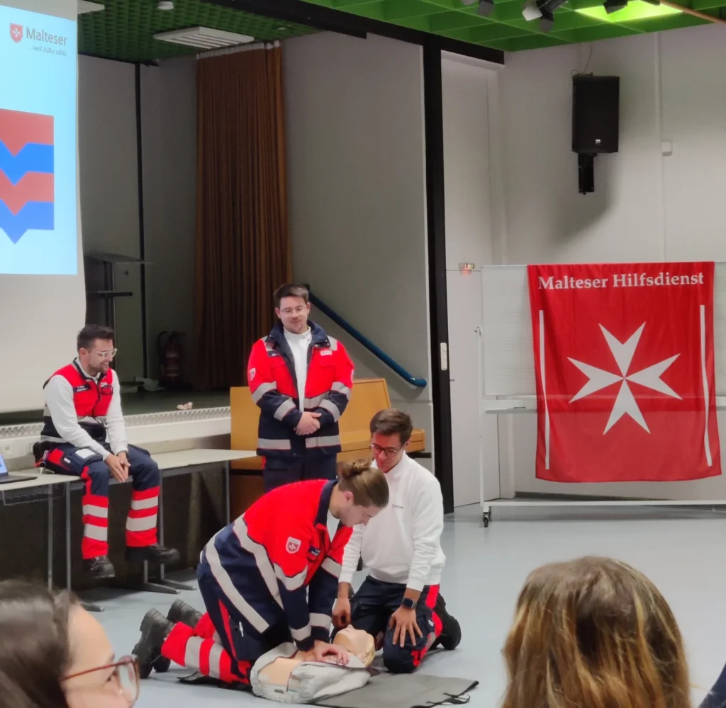 Unsere Schülerinnen und Schüler im Jahrgang 10 waren mit großem Interesse und Neugier dabei und lernten unter Anleitung von Notfallsanitäter-Auszubildenden und Notfallsanitätern von der Malteser Rettungswache Ober-Ramstadt, wie sie im Ernstfall Leben retten können: Herzdruckmassage, der Einsatz eines Defibrillators und praktische Übungen an Reanimationspuppen standen in Kleingruppen auf dem Stundenplan.