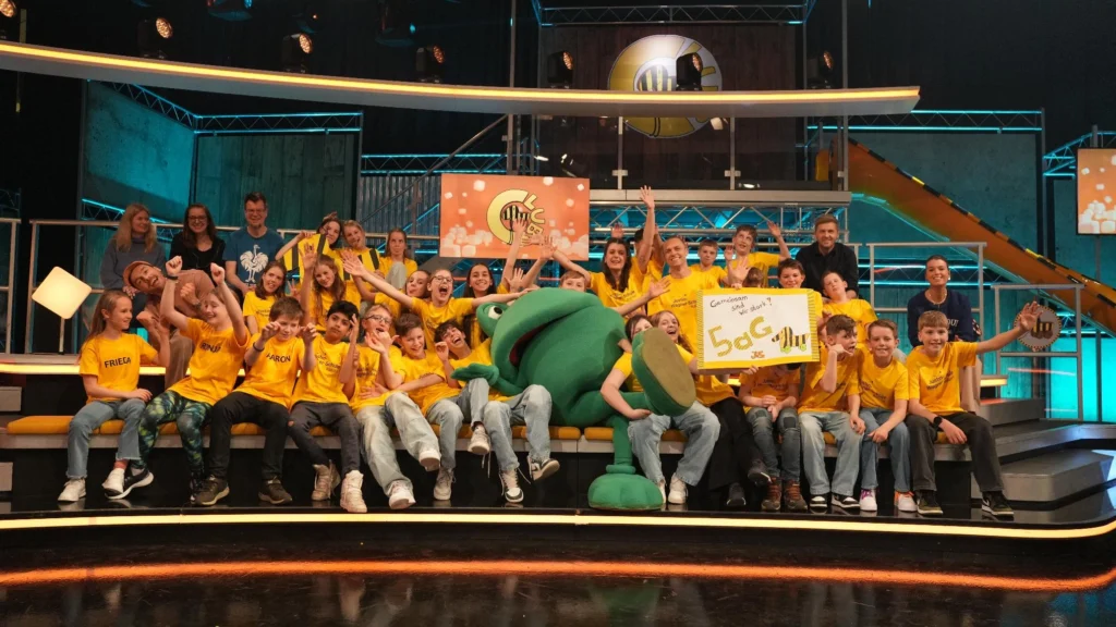 Es war einmal …. das letzte Türchen des Adventskalenders … eine riesengroße Überraschung: eine Einladung zum Tigerentenclub! Am 25.03.2025 fand die aufregende und mit Spannung und Vorfreunde erwartete Fahrt nach Baden-Baden der damaligen 05aG zu den SWR-Filmstudios statt. Die Klasse wurde von einem tollen SWR-Team empfangen und die Spiel- und Tanzkinder wurden backstage auf ihren Auftritt vorbereitet. Der Rest der Klasse bekam eine interessante Führung hinter die Kulissen des SWR mit den zahlreichen Studios und Requisiten – wie aufregend! Schließlich wurden alle in die Abläufe der Show eingeweiht und auch das Jubelgeschrei geübt, was für alle Beteiligten natürlich ein Leichtes war. Da bei der anderen Klasse, den Fröschen, zwei Lehrerinnen teilnahmen, wurde kurzerhand auch Herr Berger, der Lehrer und Busfahrer an diesem Tag, in die Show integriert.