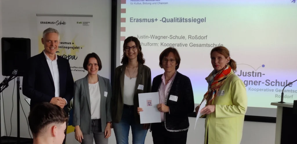 Mit dem Qualitätssiegel wird dieses besondere Engagement für europäische Zusammenarbeit sowie die erfolgreiche Umsetzung internationaler Projekte gewürdigt. Die Justin-Wagner-Schule gehört zu 22 hessischen Schulen, die diese Auszeichnung erhalten haben. In Vertretung für alle Beteiligten nahmen Frau Hentzen, Frau Schu und Frau Roßkopf die Urkunde von Herrn Dr. Lösel, Staatssekretär im Hessischen Ministerium für Kultus, Bildung und Chancen, in Wiesbaden entgegen.